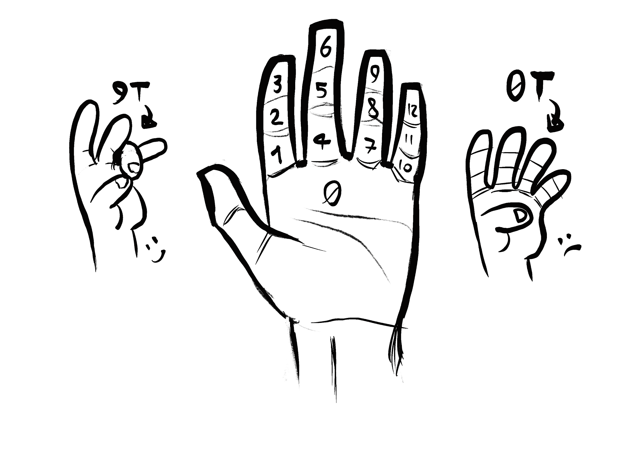 Tieni traccia del tempo contando con il pollice le falangi delle dita (indice, medio, anulare) della tua mano, d'ora in poi indicate con T. Inizi con 9T, quindi 9 falangi. Se in qualunque momento dovessi raggiungere 0T, segna mentalmente il paragrafo in cui ti trovi e vai subito al 14